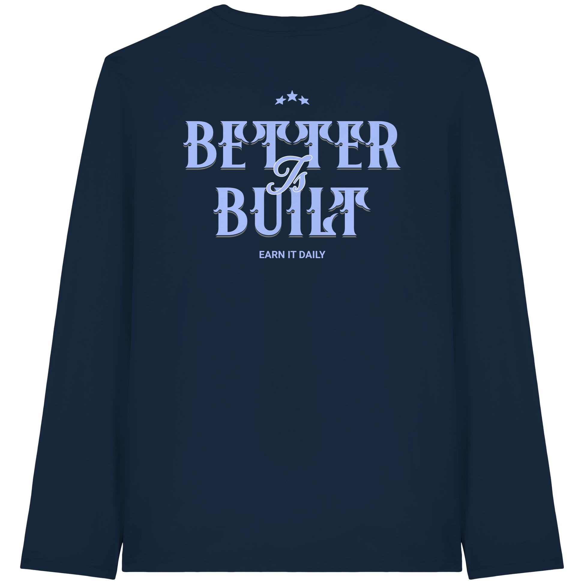 Unser Organic Longsleeve aus 100% Bio-Baumwolle steht für Fortschritt. Hinten der Print BETTER IS BUILT – ein klares Statement: Besser wird nicht gefunden, sondern gemacht. Trägt sich weich, sitzt entspannt und erinnert dich (und alle, die es lesen) jeden Tag daran, alles zu geben. Fair produziert, robust, unisex. Anziehen, rausgehen, besser bauen.